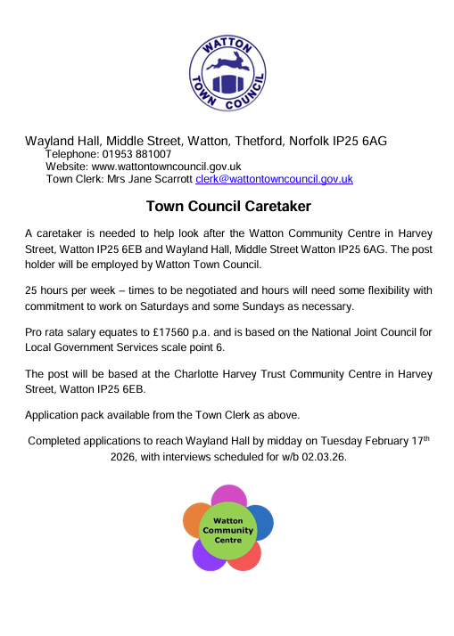 Councillor Gillian Turrant was elected as the Chairman and Town Mayor of Watton Town Council for the year 2025/26. Gillian’s charities for her term are PACT Animal Sanctuary and 1st Watton Rainbows.